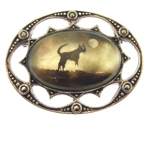 Hallmarked Sterling Silver Candle Smoked Mother of Pearl brooch with a marquersite surround. If you dont know what candle smoking is then read the information about these stunning works of art in the catagory heading. This one is set in an oval silver mount surrounded by marquersites and depicts a moon lit scene with a cat in the fore ground. I think a good title for this would be "Midnight" SIZE = 47mm X 37mm (overall). Picture is 32mm x 21mm
